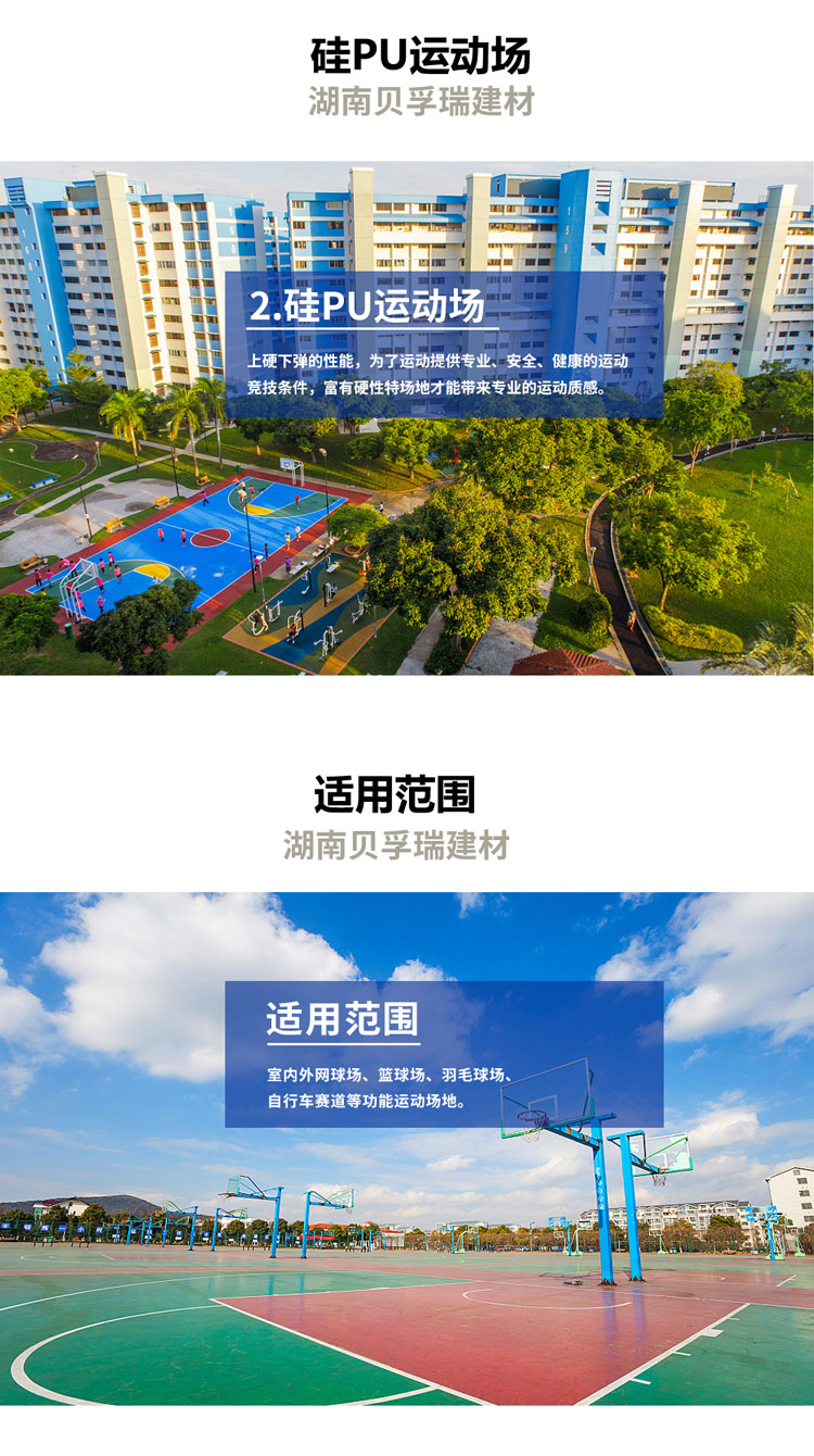 ②、超強的耐磨性:硅PU面層采用添加硅樹脂顆粒做法,其結構特征恒久穩定不變,軟硬適中,耐磨性能滿足長期高使用頻率的需要。